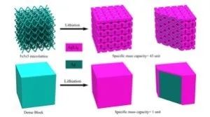△3D打印的“多孔”電極可提高能量密度。可以將電極中的材料打印成三維晶格結果。晶格意味著電極具有更大的暴露表麵積,增大化學反應麵積,電池效率更高。另外,3D打印電池模塊不需要多餘(yu) 的物質即可以實現一體(ti) 化。想象一下,特斯拉85kWh電池組由7104個(ge) 電池組成,將7104塊電池粘合在一起的膠水和電線的重量相當大了。但是如果這些變成是增材製造過程的一部分,而不是多餘(yu) 的材料,能量密度將大大提高