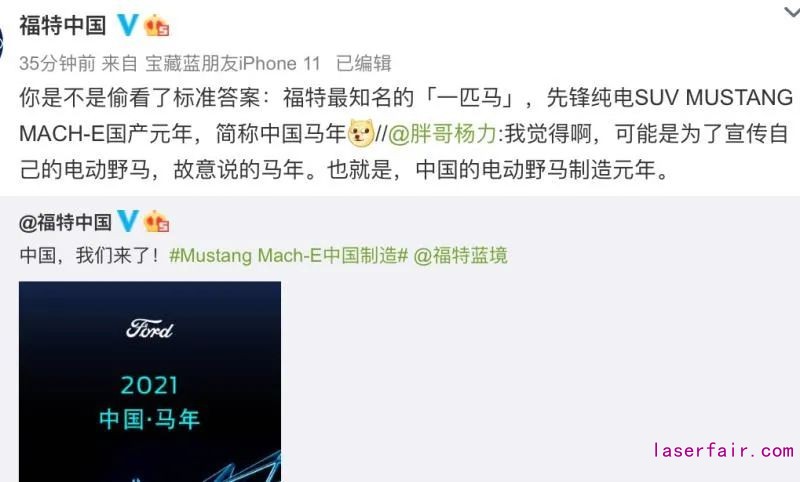 北京時間1月28日,福特中國發了一篇海報,配詞“2021 中國?馬年”。被輿論認為(wei) “古有趙高指鹿為(wei) 馬,今有福特牛馬不分。橫批:銷量下跌。”隨後,官方“辯解”稱,是旗下車型野馬國產(chan) 元年。