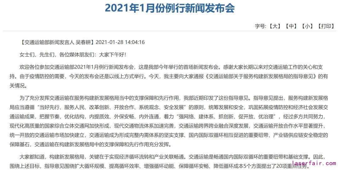 1月28日,交通運輸部新聞發言人吳春耕在例行新聞發布會(hui) 上表示,交通運輸部高度重視自動駕駛技術發展和應用,為(wei) 落實加快建設交通強國等重大戰略,把握全球科技和產(chan) 業(ye) 變革機遇,更好推動前沿技術賦能交通運輸高質量發展,在深入調研、廣泛征求意見的基礎上,製定出台了《關(guan) 於(yu) 促進道路交通自動駕駛技術發展和應用的指導意見》。