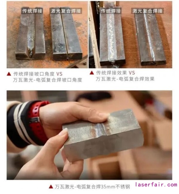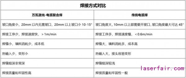 若使用萬(wan) 瓦激光-電弧複合焊,20mm以下的鋼板不需要開坡口即可完成焊接,20mm以上鋼板隻需要開傳(chuan) 統坡口角度的四分之一即可,大大壓縮坡口間隙,所需焊料成本更小,且效率可提高6-10倍,實現生產(chan) 效率和製造精度的雙重提升,牢固性也更強。