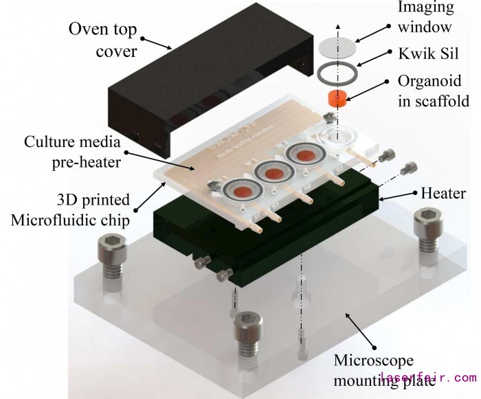 目前對生長中的器官體(ti) 進行實時觀察的技術涉及使用商業(ye) 培養(yang) 皿,在玻璃底板上有許多孔,置於(yu) 顯微鏡下。這些板子價(jia) 格昂貴,而且隻與(yu) 特定的顯微鏡兼容。他們(men) 不允許流動或補充營養(yang) 介質的生長組織。
