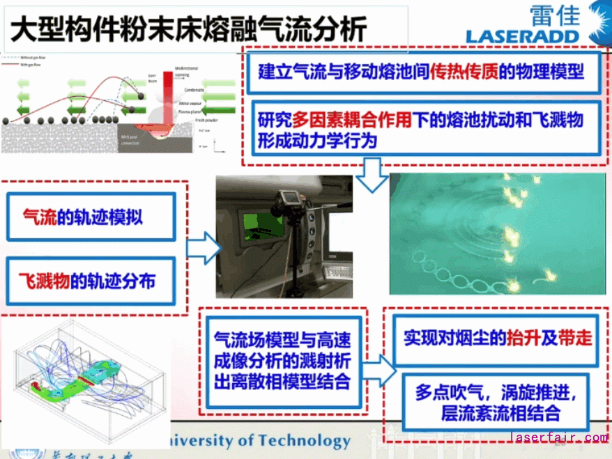 多激光大幅麵打印機麵臨(lin) 的一個(ge) 最大問題是氣流和風場的問題,打印過程中的煙塵和飛濺難以避免,在多激光情況下將更加嚴(yan) 重,氣流場流道的結構設計、處於(yu) 成型腔內(nei) 的位置、進出氣流的大小,都將對材料的成型質量控製產(chan) 生不同的影響,這是該技術普遍性的問題,楊永強教授團隊有專(zhuan) 門的博士生在從(cong) 事該方麵的工作。