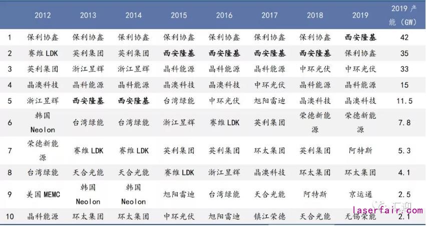 矽片產(chan) 業(ye) 布局進一步向中國大陸集中。該現象的主要原因包括:一是國內(nei) 矽片技術及成本優(you) 勢進一步顯現,連續拉晶投料量、切片等工藝方麵的技術進步,以及區位布局的電力資源優(you) 勢,中國大陸企業(ye) 在矽片環節的生產(chan) 成本呈繼續下降勢頭,較海外企業(ye) 生產(chan) 成本優(you) 勢繼續加強;二是新增單晶矽片產(chan) 能主要來自國內(nei) ,單晶矽片的市場份額加速提升,海內(nei) 外多晶矽片廠被迫關(guan) 閉或停產(chan) 的規模加大。2019年全球新增產(chan) 能超過50GW,基本位於(yu) 中國大陸。隆基、中環和晶科三大矽片廠商的新增產(chan) 能超過全球新增產(chan) 能的70%,頭部企業(ye) 產(chan) 能集中化趨勢繼續加強。