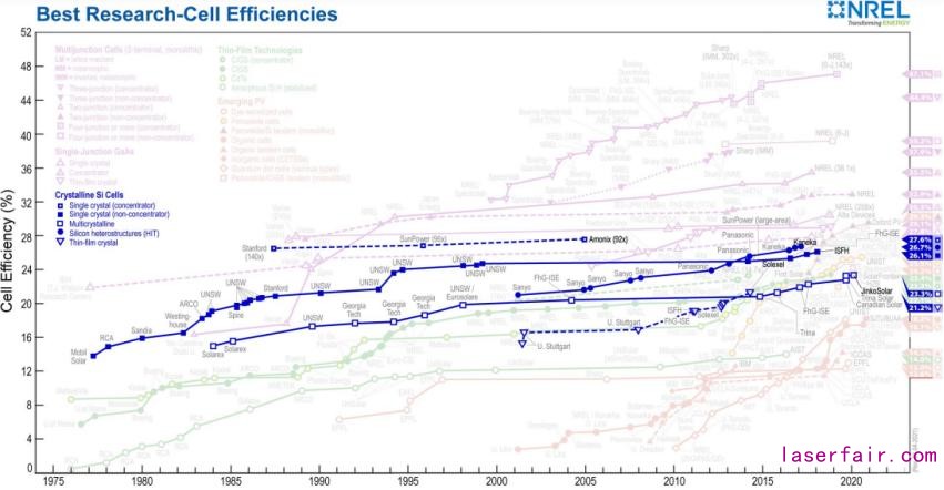 根據IHS的數據,當前矽基太陽電池占據市場份額的95%,其中以單晶矽電池為(wei) 主。單晶晶麵取向相同、無晶界,在晶體(ti) 品質、電學性能、機械性能等方麵具備優(you) 異品質和更高的轉換效率。根據2021年4月1日美國國家可再生能源實驗室最新發布的不同類型的太陽能電池最高效率數據,在實驗室條件下各類型電池效率不斷刷新,不過單晶矽電池一直比多晶矽電池效率高,商業(ye) 化大規模應用的非聚光單晶矽電池最高效率26.1%、多晶矽電池最高效率23.3%;其他新型電池尚未進入規模化商業(ye) 化應用階段,其實驗室最高效率依次為(wei) 聚光單晶矽電池27.6%,異質結晶矽電池26.7%,薄膜晶矽電池21.2%(見圖5)。