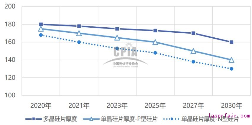 薄片化有利於(yu) 降低矽耗和矽片成本,但會(hui) 影響碎片率。目前切片工藝完全能滿足薄片化的需要,但矽片厚度還要滿足下遊電池片、組件製造端的需求。矽片厚度對電池片的自動化、良率、 轉換效率等均有影響。2020 年,多晶矽片平均厚度為(wei) 180μm,P型單晶矽片平均厚度在175μm 左右,N型矽片平均厚度為(wei) 168μm(見圖6)。