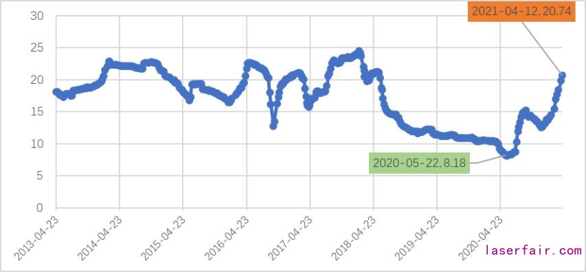 矽料是矽片成本的重要組成部分,並且隨著矽片技術的進步,矽料成本占比進一步上升。矽片企業(ye) 提升供應鏈管理能力,能夠抵禦上遊矽料價(jia) 格大幅波動是實現矽片企業(ye) 贏得競爭(zheng) 優(you) 勢的關(guan) 鍵因素之一。2013年以來多晶矽價(jia) 格相對比較穩定,去年以來多晶矽價(jia) 格從(cong) 低位10美元/kg以下增長到20美元/kg以上,價(jia) 格大幅上升給矽片企業(ye) 帶來了巨大的衝(chong) 擊(見圖4)。