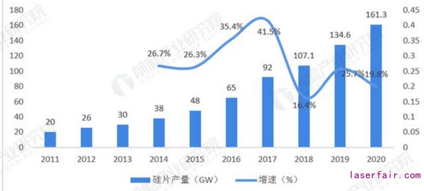 圖2 2011-2020年我國矽片產(chan) 量及增速