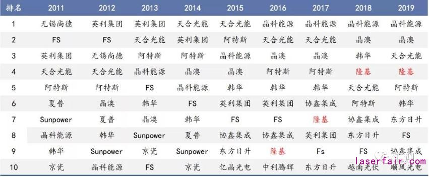 以隆基為(wei) 代表的矽片企業(ye) 向垂直一體(ti) 化方向不斷發展。從(cong) 2014年開始,隆基依托先進的單晶矽片技術開始向單晶電池組件擴展,進而逐步擴展到電站、以及最近提出的光伏加氫能等綜合能源的概念。隆基的矽片和組件在市場中的地位均得到了大幅的提高(見表2和表3)。