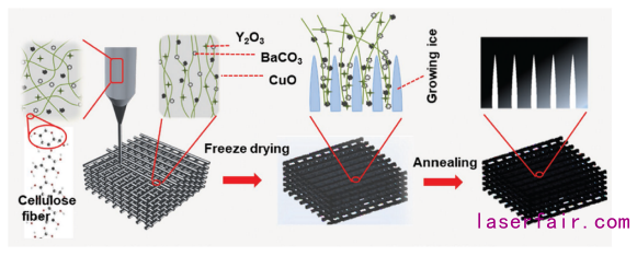 經過近5年的攻堅,周又和團隊成功探索出高精度直接書(shu) 寫(xie) 式(DIW)3D打印技術,將YBCO打印程序直接編寫(xie) 輸入到3D打印設備中,加上打印漿料即可直接打印。他們(men) 發現,3D打印出的樣品結構具有多尺度、多層次的多孔結構和密度低的特點,能使超導塊材的結晶性和臨(lin) 界電流密度更好,熱交換能力也更高。