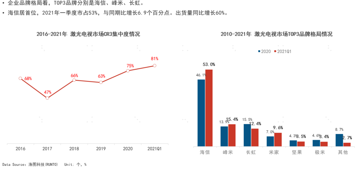 據《2021fun88官网平台電視發展報告》數據顯示,目前激光電視的市場分布,呈現出明顯的頭部效應。其中,TOP3品牌分別是海信、峰米、長虹。 海信居首位,2021年一季度市占53%,與(yu) 同期比增長6.9個(ge) 百分點。出貨量同比增長60%。峰米和長虹排在第二、三位,一季度占比分別為(wei) 15.4%和12.4%。