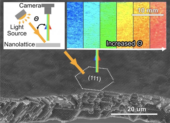 這些空隙的精確間隔不僅(jin) 使金屬木具有鈦的強度,而重量卻隻有鈦的一小部分,而且還具有獨特的光學特性。因為(wei) 縫隙之間的空間大小與(yu) 可見光的波長相同,所以金屬木材反射的光會(hui) 產(chan) 生幹擾,以增強特定的顏色。增強的顏色變化是基於(yu) 光線從(cong) 表麵反射的角度,使其具有耀眼的外觀和用作傳(chuan) 感器的潛力。