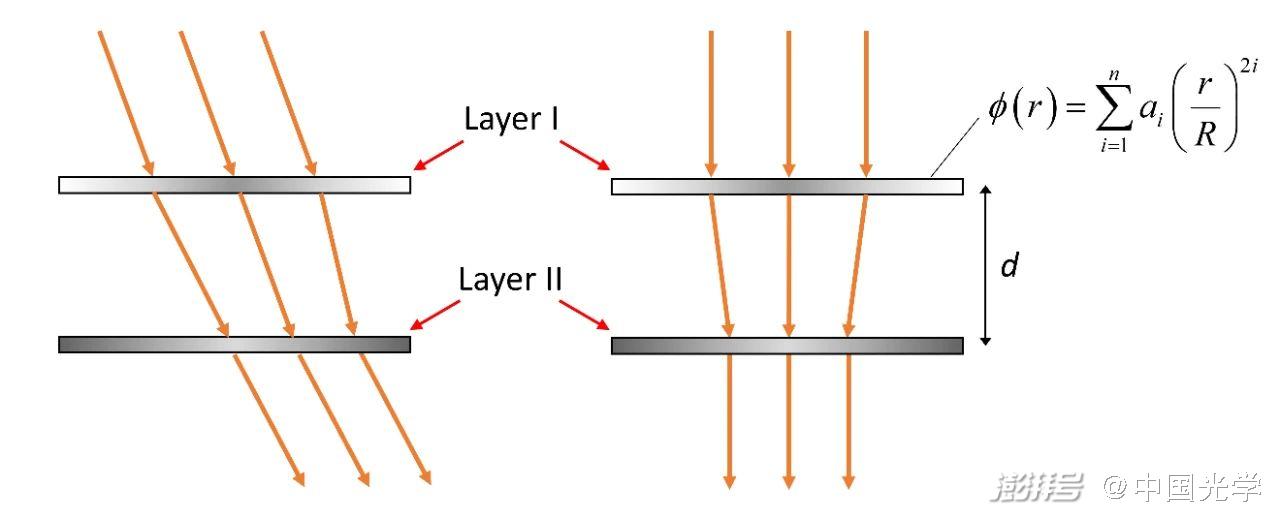 基於(yu) 液晶的平麵光子學近年來得到了廣泛的研究。相較於(yu) 需要複雜光刻製成的介電超表麵,平麵液晶光學器件得益於(yu) 液晶自組裝的性質從(cong) 而可以使製成過程大大簡化。在這些液晶器件中,液晶的取向可以便捷地通過一層很薄的表麵光取向層(10納米左右厚度)來調控。這樣,人們(men) 很容易實現在空間中任意排布折射率的各向異性,從(cong) 而實現光的幾何相位調控。這些平麵液晶器件的厚度通常在微米級別。在過去,研究人員們(men) 報道了許許多多高質量的透鏡、光柵、渦旋光處理器等等。不光是透射型器件,基於(yu) 膽甾型液晶的反射型器件最近也得到充分研究。與(yu) 此同時,對這些器件的光學性質進行主動或者被動的調控也是研究熱點之一。例如,基於(yu) 多層旋轉結構的聚合液晶被用來調控工作波長和角度響應;利用液晶對刺激響應的性質可以製成光、電、熱、機械響應器件等等。然而,目前的探究多注重於(yu) 單一液晶器件。從(cong) 單一液晶器件過渡到級聯液晶器件,我們(men) 預想更多的光學功能可以被實現,同時保持這些液晶器件的優(you) 點。