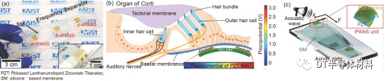 Lee等人[77]利用連續激光在PZT薄膜上製造了一種基於無機的壓電聲納米傳感器(Inorganic-based Piezoelectric Acoustic Nanosensor,IPANS),如圖8(a)所示,目的是仿生人造毛細胞模仿人類原始的毛細胞功能,它能將外界的聲音轉換為電能,並刺激聽覺神經,如圖8(b)所示為IPANS具體應用示意圖。在圖8(c)所示的IPANS中有一層有機矽膜(Silicone-basedMembrane,SM),其主要目的是分離傳入聲音的可聽頻率範圍並根據不同音頻的不同位置產生振動,再將振動轉換為電感應輸出,達到仿真效果。