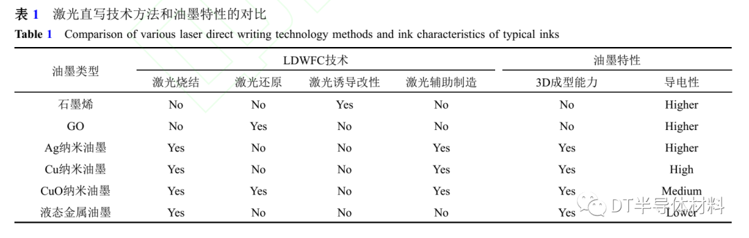 總而言之,上述用於LDWFC的激光加工技術現階段已經取得很好的進展,每種技術各有特點,適用的油墨種類也有所差別。在LDWFC中仍然存在一些挑戰:如何提高柔性電路的各項特性,如何改善激光直寫過程中的工藝方法,如何研製出性能優異的導電油墨,仍然是未來需要關注的重點方向。這裏我們簡單對比了激光直寫技術方法以及油墨特性,如表1所示。