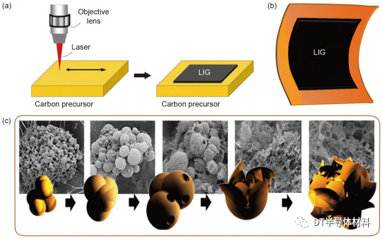 圖 3 (網絡版彩圖) (a) LIG示意圖; (b) PI上LIG的光學圖像; (c) PI粒子形態在LIG過程中轉化的FESEM圖像和不同轉換階段D渲染圖[65]. 圖片來自文獻[65], 已獲得授權
