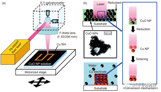 圖 2 (網絡版彩圖) (a) 激光還原CuO的實驗裝置示意圖; (b) 激光還原CuO納米油墨的工藝流程圖, 通過光化學作用和光熱作用將CuO納米油墨轉化為(wei) Cu膜[53]. 圖片來自文獻[53], 已獲得授權