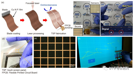 Tao等人[58]在柔性PI膜上直接LIG,製造出了一種集成了檢測和產生聲音的柔性傳感器。該傳感器可以應用於人造喉領域,它可以檢測到人喉嚨振動的不同強度和頻率,並將其轉換為可控製的聲音。當在設備上施加交流電壓時,周期性的焦耳熱會引起空氣的膨脹,從而產生聲波。當施加低偏置電壓時,喉線的振動會引起電阻的變化,導致電流波動。因此可作為檢測和產生聲音的人造喉,其利用LIG技術可以高效率、低成本地獲取,在語音控製和可穿戴領域有很好的應用前景。Park等人[78]全麵分析了激光燒結Cu納米油墨的物理和化學燒結機理特性,在熱敏聚合物襯底上製備出了彎曲性能和黏附性能優異的Cu柵,該Cu柵表現出95%的高透射率以及30Ω/m2的低薄層電阻,其中Cu柵製造示意圖如圖9(a)所示。如圖9(b)和(c)所示,他們展示了在PET膜上的多點觸控銅柵觸摸屏,它有著響應速度快、靈敏度高、耐用性好等優點。Kwon等人[79]使用激光燒結工藝在空氣環境中快速加工製備出了CuNPs薄膜,並與常規Ar氛圍下的管式爐加熱燒結工藝進行對比,顯示出激光燒結工藝製備的CuNPs薄膜具有更好的電性能和化學穩定性能,以及能夠降低Cu的氧化性能。並在PEN薄膜上成功製備出了電氣性能和機械性能良好的柔性觸摸屏,極大地提高了柔性電子的開發效率,圖9(d)–(f)為該方法製備的Cu柵透明導電體展示圖以及觸摸演示圖。
