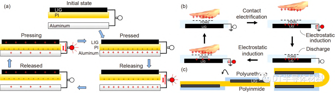 圖 6 (網絡版彩圖) (a) 使用LIG/PI雙層複合膜的TENG工作示意圖, 其中LIG為(wei) 一個(ge) 電機, PI為(wei) 電介質層; (b) 基於(yu) LIG/PDMS合材料組成的TENG工作示意圖; (c) 由單張PI製成的柔性無金屬TENG示意圖[75]. 圖片來自文獻[75], 已獲得授權