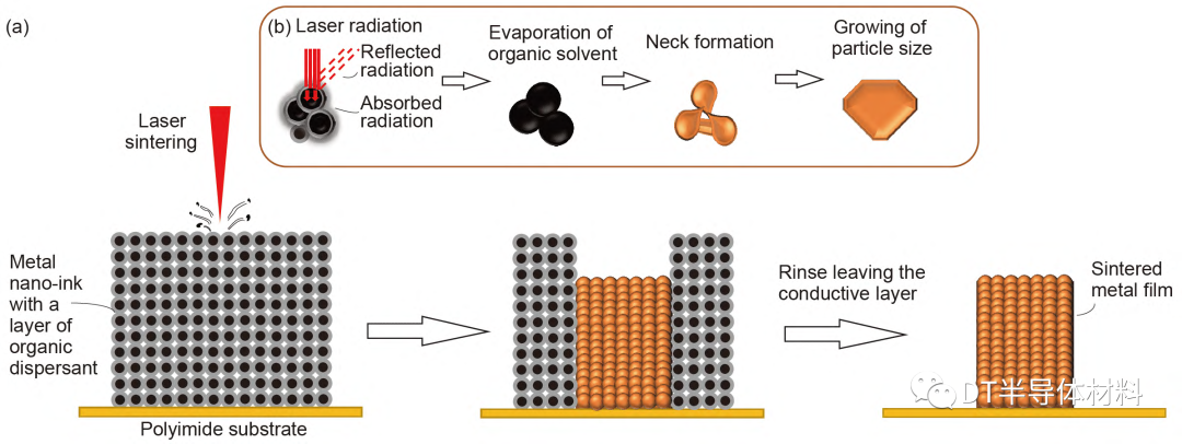 圖 1 (網絡版彩圖) (a) 激光燒結工藝流程簡圖, 將金屬納米油墨塗覆在聚合物上並在幹燥處理之後進行激光燒結, 再衝(chong) 洗留下導電層; (b) 激光燒結過程中金屬納米油墨的變化過程示意圖