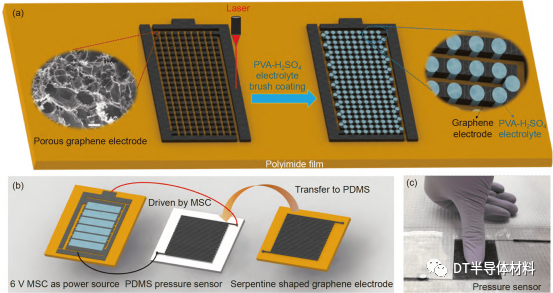 圖 7 (網絡版彩圖) (a) 平麵柔性高壓MSC製備示意圖, 左圖為(wei) 激光誘導製備石墨烯正方形圖案, 右圖為(wei) H2SO4-PVA電介質將正方形串聯示意圖; (b) 激光誘導的蛇形石墨烯電路圖案, 轉移到PDMS上作為(wei) 壓阻式微傳(chuan) 感器示意圖, 並且該壓阻式微傳(chuan) 感器由一個(ge) 6 V的MSC驅動; (c) 手指按壓壓阻式微傳(chuan) 感器照片[76]. 圖片來自文獻[76], 已獲得授權