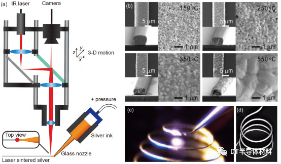 圖 4 (網絡版彩圖) (a) 激光直寫(xie) 輔助墨水直寫(xie) 製造3D電路裝置示意圖[9]; (b) 不同退火溫度下Ag油墨晶粒的生長SEM圖像[12];(c), (d) 激光直寫(xie) 輔助墨水直寫(xie) 方法製造的微螺旋彈簧導體(ti) [9]. 圖片來自文獻[9,12], 已獲得授權