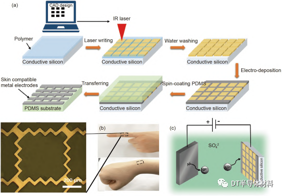 圖 5 (網絡版彩圖) (a) 激光直寫(xie) 輔助電沉積製造柔性金屬電極工藝的示意圖, 具體(ti) 包括激光直寫(xie) 示意圖和電子沉積過程示意圖以及基板反轉過程示意圖; (b) 具有微彈簧結構的鎳電極的光學顯微鏡圖像以及佩戴在手指關(guan) 節、手腕上的電極測試圖像; (c) 電沉積過程示意圖[8]. 圖片來自文獻[8], 已獲得授權