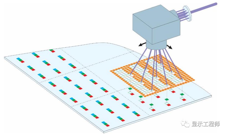 對於(yu) 巨量轉移過程,Coherent采用了248nm的激光來轉移GaN MicroLED,激光束通過一個(ge) Mask和投影鏡頭,可以實現1000個(ge) die的同時轉移。