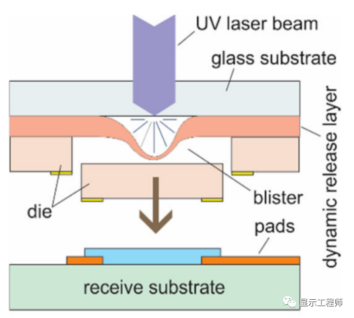 釋放層吸收激光的能量,而將其上的MicroLED彈射出去,轉移到目標基板上。