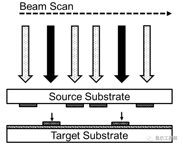 在微電子工業(ye) 中,激光技術得到了廣泛的應用,在巨量轉移技術中,也有研究人員試圖借助激光來實現巨量轉移的過程,這就是激光轉移流派。
