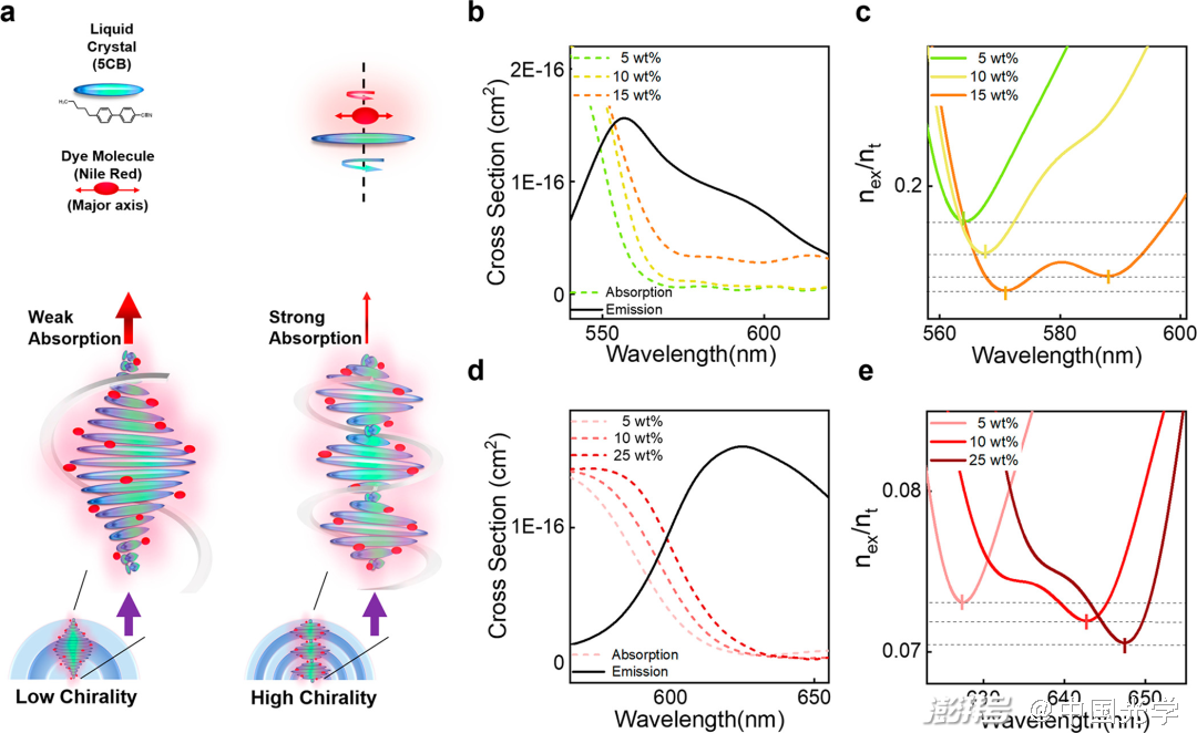圖2:單個(ge) 液晶球與(yu) 兩(liang) 個(ge) 組合的激光遠場照片以及對應的CIE坐標。研究人員進一步證實了激光波長隨拓撲結構變化的規律與(yu) 手性分子的摻雜濃度有關(guan) 。當液晶分子受手性分子的影響而呈現螺旋排列時,其中的染料分子趨向於(yu) 同液晶分子排列一致。研究者用兩(liang) 種染料摻雜的液晶球(R,Y)驗證液晶激光波長漂移與(yu) 手性分子濃度之間的關(guan) 係。如圖3所示,當更高濃度的手性分子被摻入液晶球中,液晶球的吸收響應增強。並且隨著手性分子濃度的增加,液晶球閾值波長也向長波長漂移。