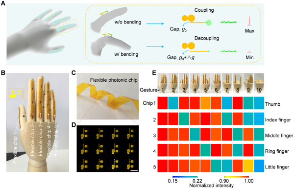 研究人員進一步將這樣的微盤構築成耦合微盤腔,實現了單模激光輸出,顯著地增強了傳(chuan) 感信號的可辨識度與(yu) 準確度。在此基礎上,科研團隊將一個(ge) 懸浮微米線波導集成到耦合微腔上,構築了對柔性襯底形變響應的傳(chuan) 感單元,並用於(yu) 人體(ti) 運動探測。作為(wei) 一種概念性的光子皮膚展示,研究團隊將柔性耦合線-盤傳(chuan) 感芯片貼附在人手模型上,實現了多種手勢的識別(圖2)。原則上,所有伴有關(guan) 節運動的人體(ti) 動作都可以用柔性耦合線-盤傳(chuan) 感芯片進行識別。這種新型柔性光子學芯片在人的本體(ti) 感覺重構、人機交互和機器人自保護係統等領域具有廣泛的應用前景。