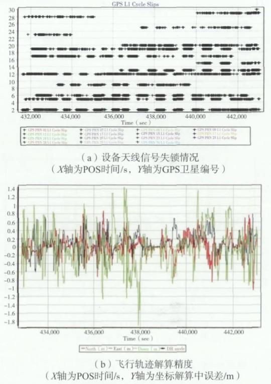 實際作業(ye) 過程中,通過對第一架次的飛行數據現場初步處理發現,數據位置誤差約±1.8m、高程誤差約±2.0m,數據質量較差,誤差嚴(yan) 重超限,無法對測深條帶數據進行拚接。經對數據進行進一步處理分析後發現,設備天線信號失鎖嚴(yan) 重,飛行軌跡數據融合解算誤差過大(信號失鎖情況見圖2)。而主螺旋槳轉動時對GNSS信號的遮擋是導致衛星信號失鎖的主要原因。