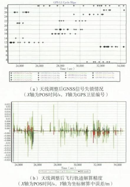 飛機返場重新調整天線位置,分別在駕駛艙和主螺旋槳與(yu) 尾翼螺旋槳的結合部等飛機不同部位進行了信號質量測試,測試結果表明,GNSS天線安裝在主螺旋槳與(yu) 尾翼螺旋槳的結合部時,信號質量最佳。天線安裝位置見圖3,天線位置調整後信號失鎖情況見圖4。