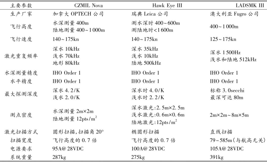 表1 CZMIL、HawkEyeⅢ及LADSMKⅢ主要技術指標對比