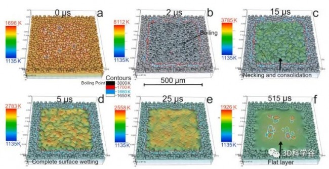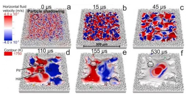 圖 3. ALE3D 模型顯示了 ~26 J/cm2 熔化脈衝(chong) (10 ns–100 μs(脈衝(chong) 長度 Seurat 專(zhuan) 有))動力學的不同階段。50 µm 厚的直徑為(wei) 35 µm 的粉末顆粒層用作起始層。粉末顆粒的頂部在 2 μs (b) 時達到沸騰溫度,此後立即發生聚結。液體(ti) 運動基本上在 100 μs (e) 時完成。凹坑缺陷此時形成但稍後固化。隨著凝固的繼續,由於(yu) 表麵張力和流體(ti) 流動將液體(ti) 吸入中心 (e, f),在液體(ti) 中心開始形成山丘型缺陷。© Science Direct