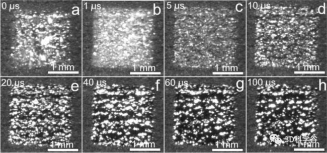 可以看到粉末迅速熔化並繼續凝聚成更大的液滴,直到 40 μs,並最終形成一些較寬的液體(ti) 區域,如 40 和 100 μs 之間的暗區所見。大約 100 μs 後,液體(ti) 幾乎靜止擴張並開始凝固。