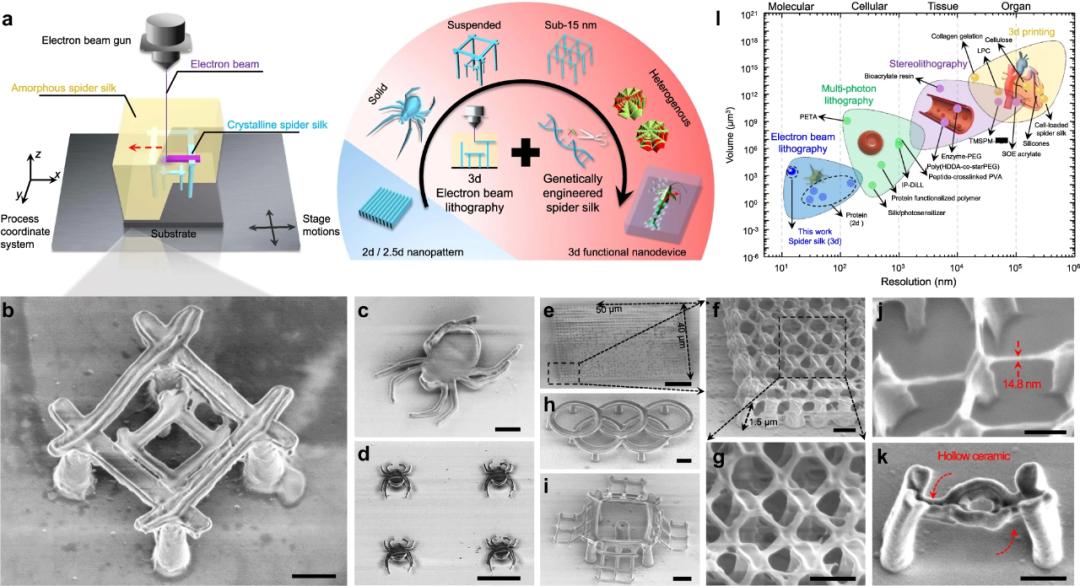 接著,他們(men) 通過基因工程將合成重組蛛絲(si) 蛋白作為(wei) 抗蝕劑,將純水作為(wei) 抗蝕劑顯影劑。具有精確定向的非結晶(水溶)和結晶(不溶於(yu) 水)蛛絲(si) 之間的結構轉變進行明確定義(yi) ,接近蛋白質基質內(nei) 的分子水平。定義(yi) 曝光點的電子的軌跡由施加的加速電壓來調節,從(cong) 而使得 3 D 納米製造具有很高的結構複雜度。通過這種方法,研究者使用重組蛛絲(si) 蛋白製造了一係列具有不同幾何和結構複雜度的 3D 複雜納米結構,其中最小特征尺寸為(wei) 14.8nm,具體(ti) 如下圖 1j 所示。
