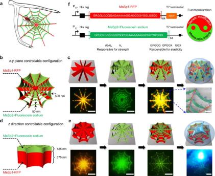重組蛛絲(si) 蛋白的基因或介觀修改可以賦予 3 D 納米組件和納米器件不同的功能。得益於(yu) 合理的設計和獨創性,蛛絲(si) 可以從(cong) 不同的角度進行重組,並且 3D 納米結構的組成、形狀和功能能夠得到很好地配置。這就為(wei) 使用 3D EBL 製造的功能性重組蛛絲(si) 蛋白中構建異質、分層的納米結構提供了可能。