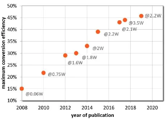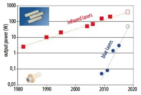 應用於材料加工的激光光源發展迅速。全新藍光激光棒的光功率可以高達100瓦。紅外激光棒可實現以前被認為幾乎無法企及的效率。大功率激光二極管作為(wei) 材料加工激光係統的光源正在發揮著越來越重要的作用。紅外激光棒具有極高的光功率,其功率和效率目前已達到一個(ge) 全新水平。另外,值得注意的是藍光波長激光棒,其在實驗室中的光功率可達100瓦(W)。這是一個(ge) 巨大飛躍,因為(wei) 不到十年前,藍光激光二極管隻有幾瓦的功率。高功率密度令激光輻射成為(wei) 一種高效的工具,可以將定量的能量傳(chuan) 輸到工件特定區域,並在非接觸的情況下對這些區域進行精確加熱。典型的應用包括各種金屬和塑料的雕刻、塗層、焊接和切割等。根據VDMA 2019的《激光技術世界》統計,目前用於(yu) 金屬切割和焊接的大功率激光工具占據了全球材料加工激光係統45%左右的市場份額。目前,大功率半導體(ti) 激光器的應用也越來越廣泛,它既可直接用作激光加工工具,也可以用於(yu) 泵浦光纖或固態激光器。與(yu) 二氧化碳激光器或閃光燈抽運固態激光器相比,它的效率更高,結構更緊湊。其核心是半導體(ti) 激光二極管,通常為(wei) 光功率較高的激光棒。多個(ge) 激光棒堆疊在一起可用作工業(ye) 半導體(ti) 激光器的光源,此類激光器的光功率目前可以達到100千瓦(kW)。用於(yu) 材料加工的激光二極管的核心參數包括波長、光功率、電光轉換效率(WPE)和光束質量。這些是衡量一個(ge) 完整係統效率以及成本效益的必需參數。較高的光功率和效率可減少係統所需的激光芯片數量,從(cong) 而降低耦合和冷卻成本以及光學係統複雜性。光束質量決(jue) 定了可以耦合進光纖的激光功率的大小,適當的波長則能夠確保加工材料充分吸收激光能量。目前,由於(yu) 大多數使用激光加工的材料可吸收約1 μm波長的光,所以在激光加工行業(ye) 中,紅外激光器的應用得到了較為(wei) 廣泛的普及。銅是電氣工程中最重要的原材料之一,在電池、電機或斷路器的電力傳(chuan) 輸等方麵發揮著核心作用。例如,在用於(yu) 電動汽車或儲(chu) 能係統的鋰離子電池中,每個(ge) 電池通過銅介質實現連接導通。這時,由於(yu) 高工作電流,這些連接會(hui) 受到較高熱應力的影響。傳(chuan) 統的焊接接頭在這樣的情況下會(hui) 不夠穩定,因此激光焊接的應用實現了高速的增長。但是銅會(hui) 反射大量紅外波長,其他有色金屬(如金或鋁)也有類似情況(圖1)。如果采用紅外激光來進行加工,就需要非常高的激光功率。除了能耗高之外,工藝的可控性也相對較差。一旦銅在高溫下熔化,它就會(hui) 大量吸收紅外光。當融化的銅“沸騰”後,會(hui) 形成孔隙並產(chan) 生飛濺。焊接質量差也會(hui) 影響其導電性等性能。圖1顯示了金和銅的光譜吸收對比情況。銅吸收藍光的能力是紅外光的12倍,同時也是綠光的1.2倍。對於(yu) 金來說,這些係數分別為(wei) 50和2.2。因此,在加工中,當波長低於(yu) 500 nm時,可實現最高的係統效率。圖1:銅、金等有色金屬對藍光的吸收能力比紅外波長強得多。目前藍光工業(ye) 半導體(ti) 激光器的光功率可達到幾百瓦到幾千瓦。開發基礎的大功率藍光激光二極管是其中的關(guan) 鍵任務。在不到十年前,其輸出功率還在毫瓦至幾瓦範圍內(nei) ,可用於(yu) 藍光驅動器、投影機或汽車頭燈等應用。現在,藍光激光二極管迎來了高速的發展,輸出效率和功率有了長足的提升。艾邁斯歐司朗不斷提高其450 nm單個(ge) 發射器的效率,從(cong) 2008年功率為(wei) 60毫瓦時15%的效率提高至現在功率為(wei) 2.2瓦時效率達到46%。為(wei) 了將工業(ye) 二極管激光器光源用於(yu) 有色金屬加工,必須繼續提高其將其性能水平。作為(wei) 政府資助的光子計劃(EFFILAS)的組成部分,BLAULAS項目致力於(yu) 開發更高功率和效率的藍光激光器和相應的高功率激光二極管。圖2:艾邁斯歐司朗光電半導體(ti) 在10年內(nei) 將藍光激光二極管的轉換效率提高近三倍。與(yu) 紅外係統類似,藍光係統也依賴於(yu) 大功率激光棒。一開始,專(zhuan) 家們(men) 對這種方法能否成功用於(yu) 銦镓氮(InGaN)材料係統表示懷疑。因為(wei) 它具有相對較高的晶體(ti) 缺陷密度,甚至在某些情況下,具有缺陷的發射點可能會(hui) 破壞整個(ge) 激光棒。因此,第一步需要驗證和改進芯片製程和一致性,接下來是從(cong) 設計和工藝步驟上進行優(you) 化。2018年,艾邁斯歐司朗推出了全球首款藍光激光棒。在實驗室中,這款激光棒可在60 A的電流下實現98 W的輸出功率。功率為(wei) 50 W時的最高效率達到46%。2019年,開發人員將其功率突破了100 W大關(guan) ,達到107 W。這款激光棒寬9.2 mm,腔長1.2 mm,由23個(ge) 發射器組成,每個(ge) 發射器的孔徑寬度為(wei) 30 μm。400 μm的間距可確保7.5%的低填充係數,這可防止相鄰發射器之間的熱串擾,並避免產(chan) 生額外的熱量。通過這種設置,可以確保閾值電流恒定在4.5 A。在30 A / 50 W的工作點,橫向和垂直輻射角(慢軸和快軸發散角)約為(wei) 7°和37°(95%能量的值)。即使在工作電流發生變化的情況下,慢軸發散角也始終低於(yu) 8°。因此,激光波束可與(yu) 現有的透鏡係統很好地準直,並有效地耦合到玻璃光纖中。基於(yu) 這些激光棒優(you) 異的性能,2019年首款光功率超過1 kW的藍光半導體(ti) 激光器問世。圖4:適用於(yu) 有色金屬的藍光:基