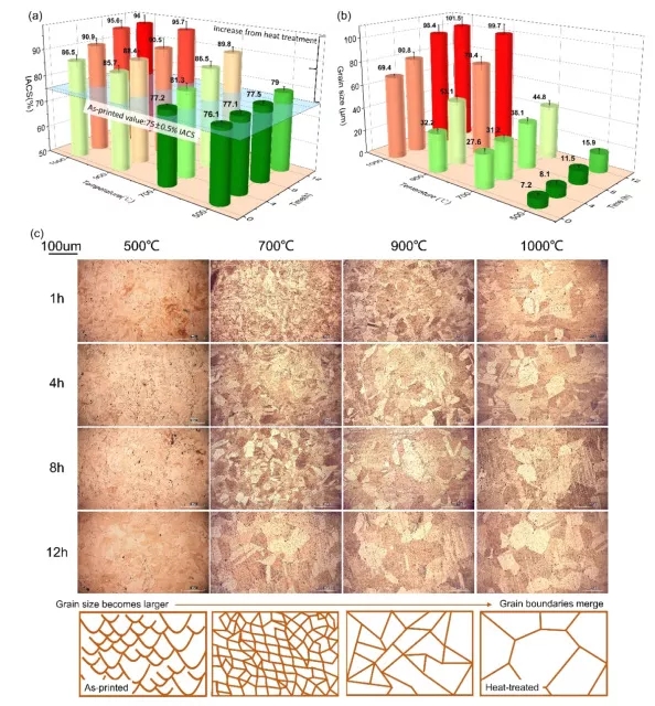hp-LPBF 工藝中的 0.05 mm HD 已被證明是最佳參數,並且通過理論計算解釋了導致 LOF 現象的低 HD 和高 HD,這證明了 HD 對能量吸收的影響。對1~12 h和500~1000 ℃的熱處理參數進行了測試,通過1000 ℃ 12 h的熱處理可以達到96% IACS和101.5 μm純銅晶粒尺寸的最佳條件。