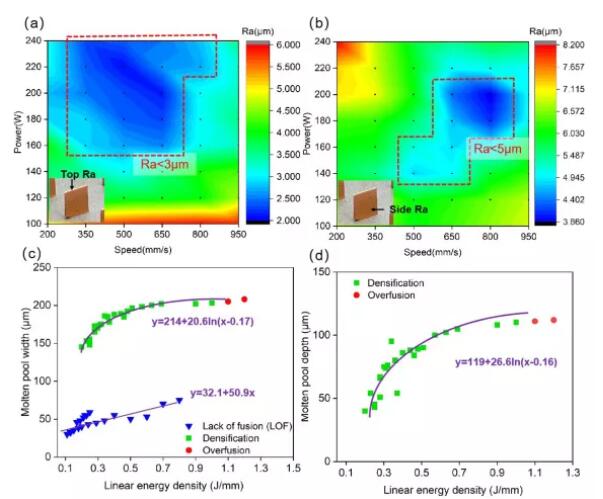 研究團隊研究了由具有不同參數的單軌道打印的薄壁尺寸和粗糙度。在 160-200 W 功率和 650 mm/s 掃描速度下,可以實現頂麵 Ra 小於(yu) 3 µm 和側(ce) 麵 Ra 小於(yu) 5 µm 的粗糙度。hp-LPBF在激光功率為(wei) 200 W、掃描速度為(wei) 600 mm/s、HD為(wei) 0.05 mm的條件下實現了RD為(wei) 99.6%、頂/側(ce) 表麵粗糙度Ra為(wei) 4.2/7.8 µm的批量打印。