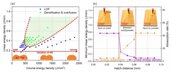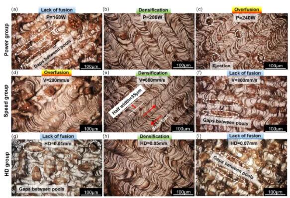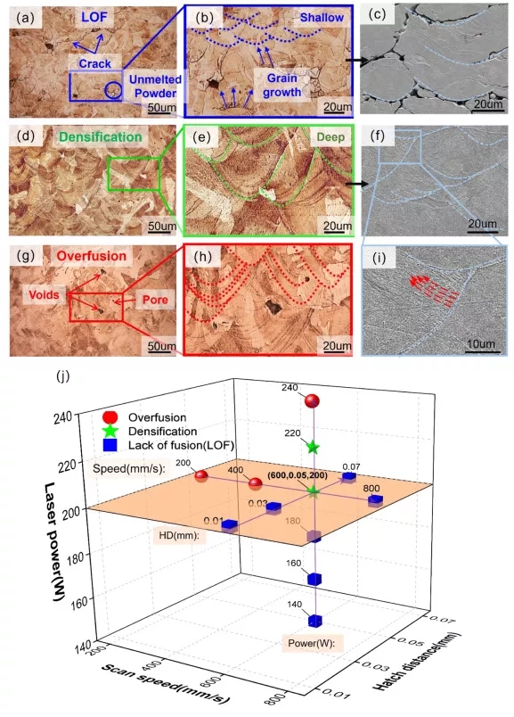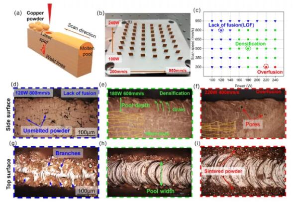 在低功率下打印高反射組件是一種有吸引力的替代方案。通過減小激光光斑、切片層厚度和粉末尺寸,同時保持激光體(ti) 積能量密度,低功率激光可用於(yu) 製造完全致密的部件。據報道,較小的銅粉能夠吸收更多的激光能量。因此,進一步同時減小激光光斑尺寸、粉末尺寸和打印層厚是正確的方向。圖1。(a)薄壁的製作方法(b),(c) 基板上所有薄壁樣品的製作結果和分類 (d)-(f) 側(ce) 麵,以及 (g)-(i) 頂麵LOF ,分別為(wei) 致密化和過度融合樣品。圖2 (a), (b) 不同參數組製作的頂/側(ce) 麵粗糙度Ra (c), (d) 寬度/深度與(yu) LED的關(guan) 係及擬合結果。圖3 (ac) LOF 側(ce) 表麵的微觀結構,(df, i)致密化,(gh) 過度融合,(j) 不同參數組的樣品分類。圖5 不同參數下熔池形態的變化,(a)-(c)功率組,(d)-(f)速度組,(g)-(i)HD組。圖 7 (a)熱處理後樣品的電導率,(b) 熱處理後樣品的晶粒尺寸,(c)不同側(ce) 麵微觀結構的光學顯微照片,底部說明了它們(men) 對應的晶粒尺寸。圖 8 (a) 壁厚為(wei) 100 µm 的增材製造TPMS結構 (b) TPMS 壁的橫截麵微觀形貌,(c) 頂/側(ce) 表麵的壁厚 (d) 頂/側(ce) /底表麵粗糙度 Ra。圖 9 (a) 線性/體(ti) 積能量密度表示的工藝窗口(b) 不同HD的最小LED和吸收率的理論計算結果。