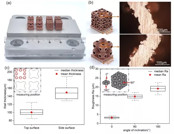 hp-LPBF 的最小頂壁厚度為(wei) 100 µm,用於(yu) 打印複雜的純銅部件。最小側(ce) 壁厚度為(wei) 149 µm,頂/側(ce) /底表麵粗糙度顯示 Ra 為(wei) 3.3/14.8/19.2 µm。與(yu) 打印純銅的其他增材製造技術相比,hp-LPBF 具有高分辨率和低粗糙度的綜合處理能力。