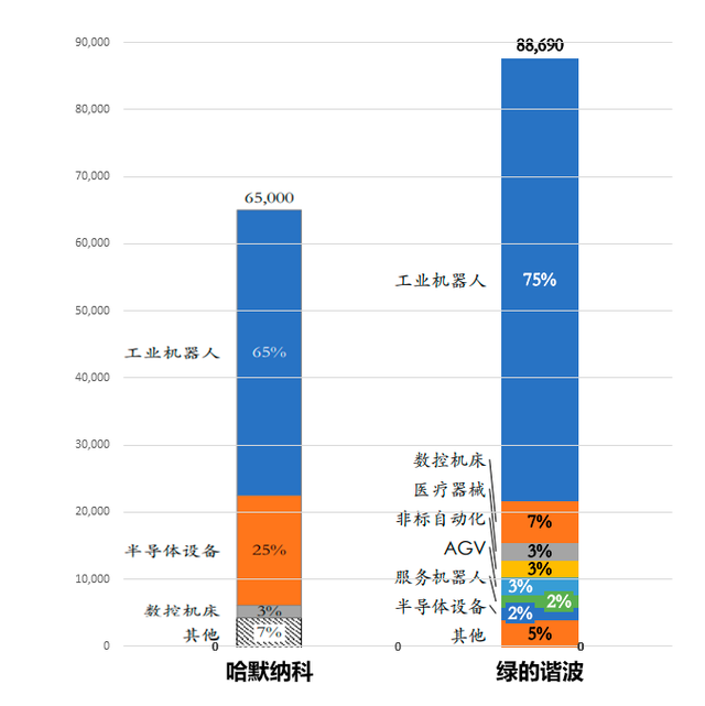 即使綠的諧波最值得誇耀、擊退哈默納科的工業(ye) 機器人領域,在細分市場的應用占比仍然暴露出嚴(yan) 重問題。