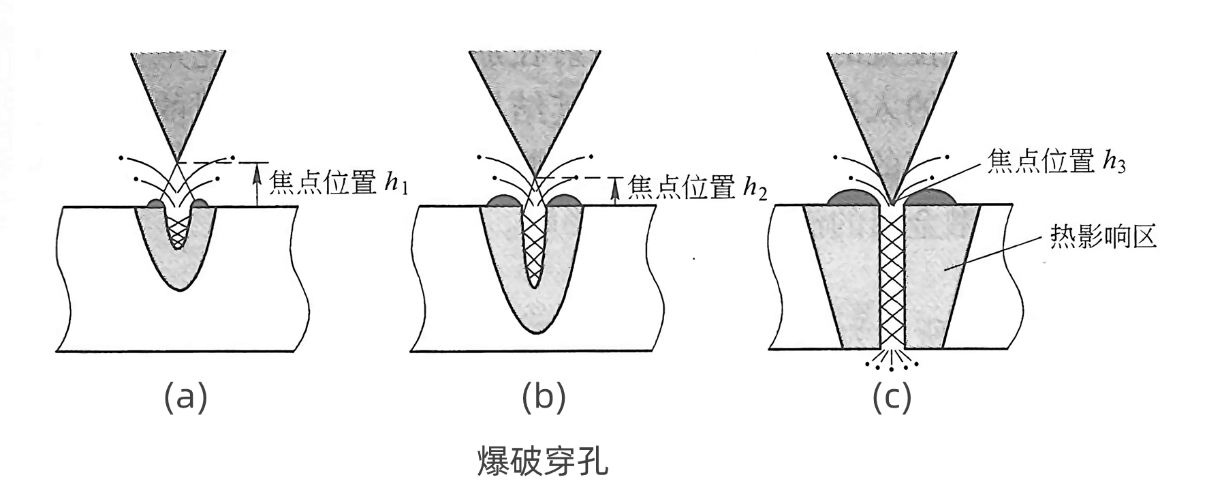 爆破穿孔的原理:用一定能量的連續波激光束照射於(yu) 被加工物體(ti) ,使其大量的吸收能量而熔融,形成一個(ge) 凹坑,然後由輔助氣體(ti) 將熔融材料去除形成一個(ge) 孔,達到快速穿透的目的。