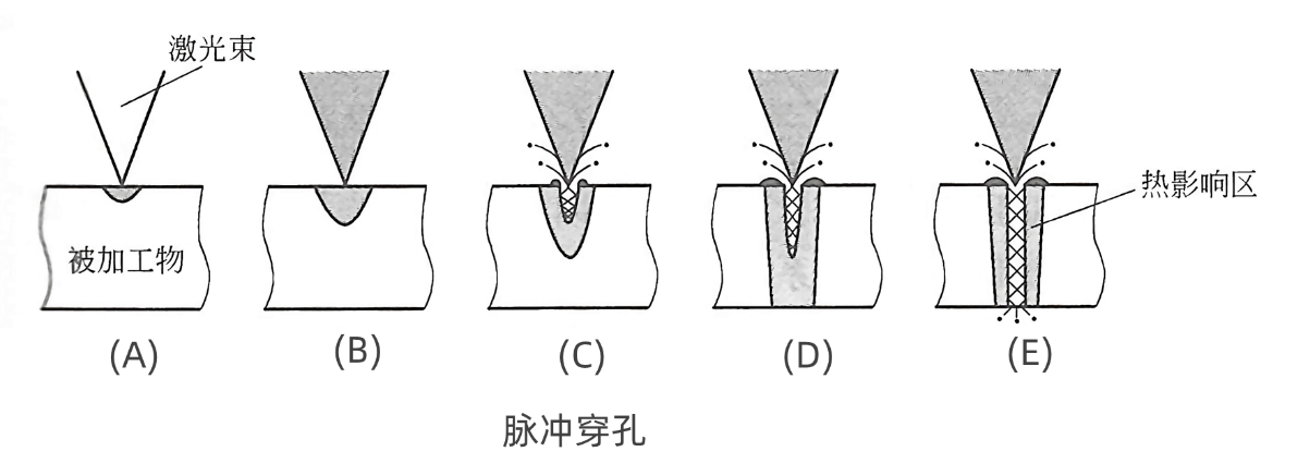 其過程如下圖所示:在激光束照射到被加工物上後,首先會(hui) 加熱材料表麵,如(A)所示;隨著加熱逐漸深入起到穿孔的作用,即(B)~(C)~(D),直到最後(E)所示的穿透。整個(ge) 穿孔過程不是一次完成的,而是多次不斷循序漸進,逐漸深入,直到穿透。因此,該方法穿孔的時間相對較長;但是,得到的孔較小,對周圍的熱影響也更小。