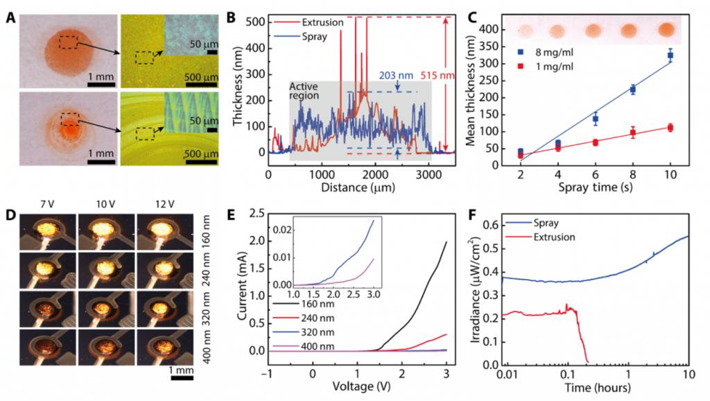 同時,為(wei) 提高器件的發光性能,他探索了在同一台打印機上進行多模態打印的可能。即采用擠壓打印的方式,來打印大多數功能層,而對層厚和表麵形態要求很高的發光層,則采用噴塗打印的方法,來提高這一層的光學和電學性能。