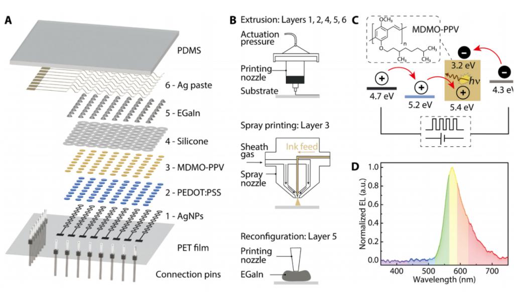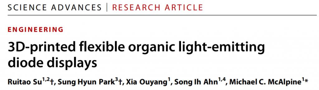 1 月 7 日,相關(guan) 論文以《3D 打印柔性有機發光二極管顯示器》(3D-printed flexible organic light-emitting diode displays)為(wei) 題發表在 Science Advances 上 [ 1 ] 。