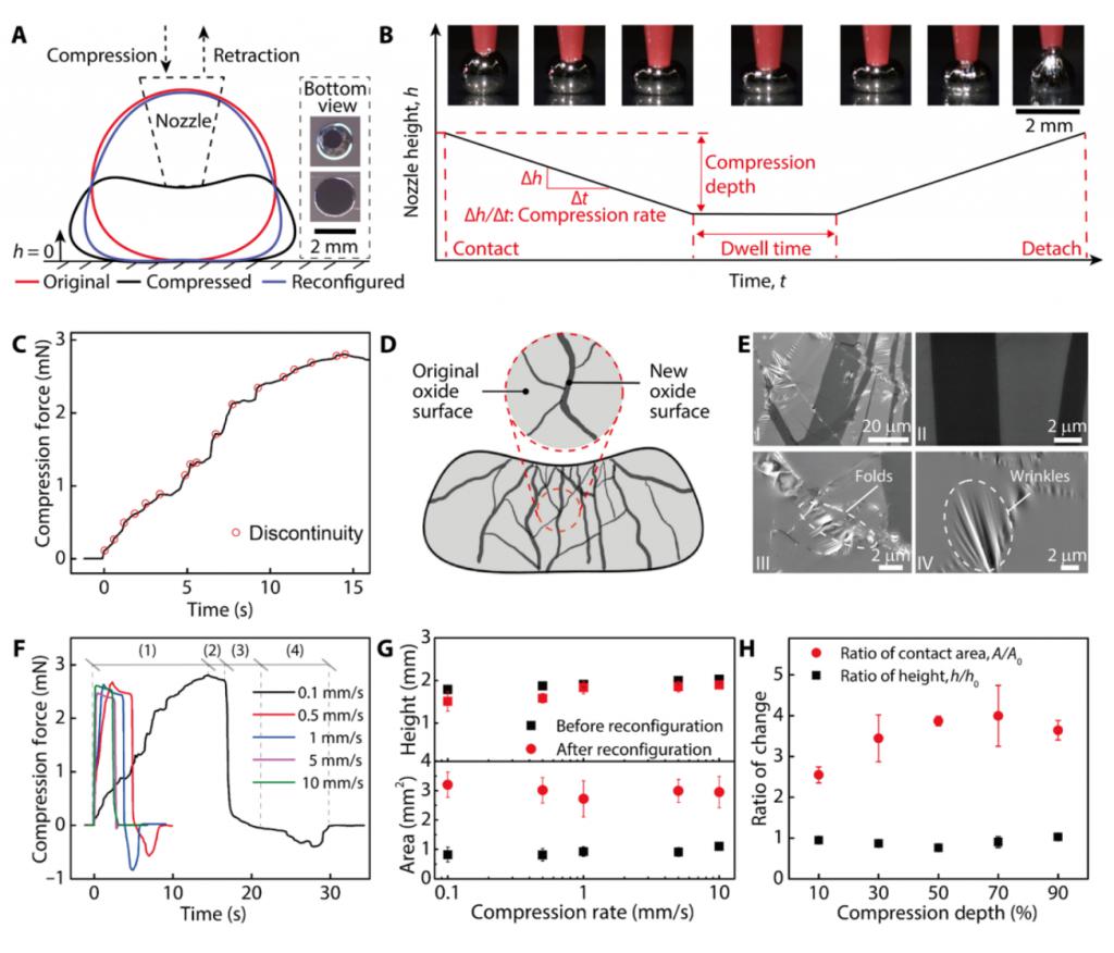 如果應力進一步增加,氧化層就會(hui) 破裂,而新暴露出來的液態金屬又會(hui) 快速被氧化,從(cong) 而鞏固新形成的液滴形態。