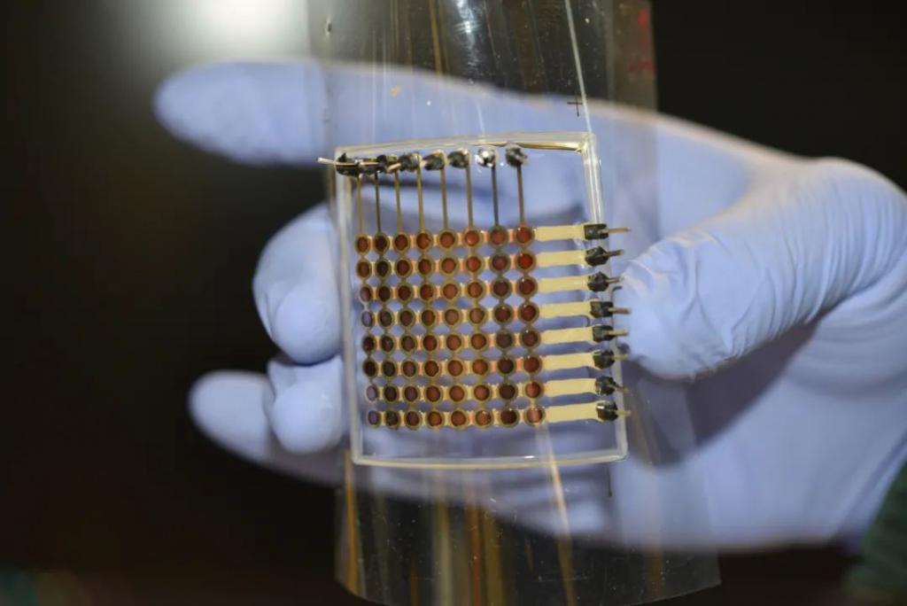 如下圖所示,為(wei) 提高打印的自動化程度,蘇瑞濤設計了陽極和陰極導線縱橫交錯的陣列結構,並采用可打印性極高的銀顆粒導電膠作為(wei) 陰極導線。